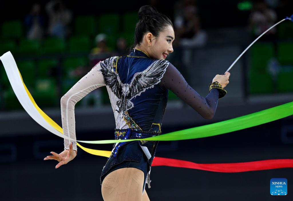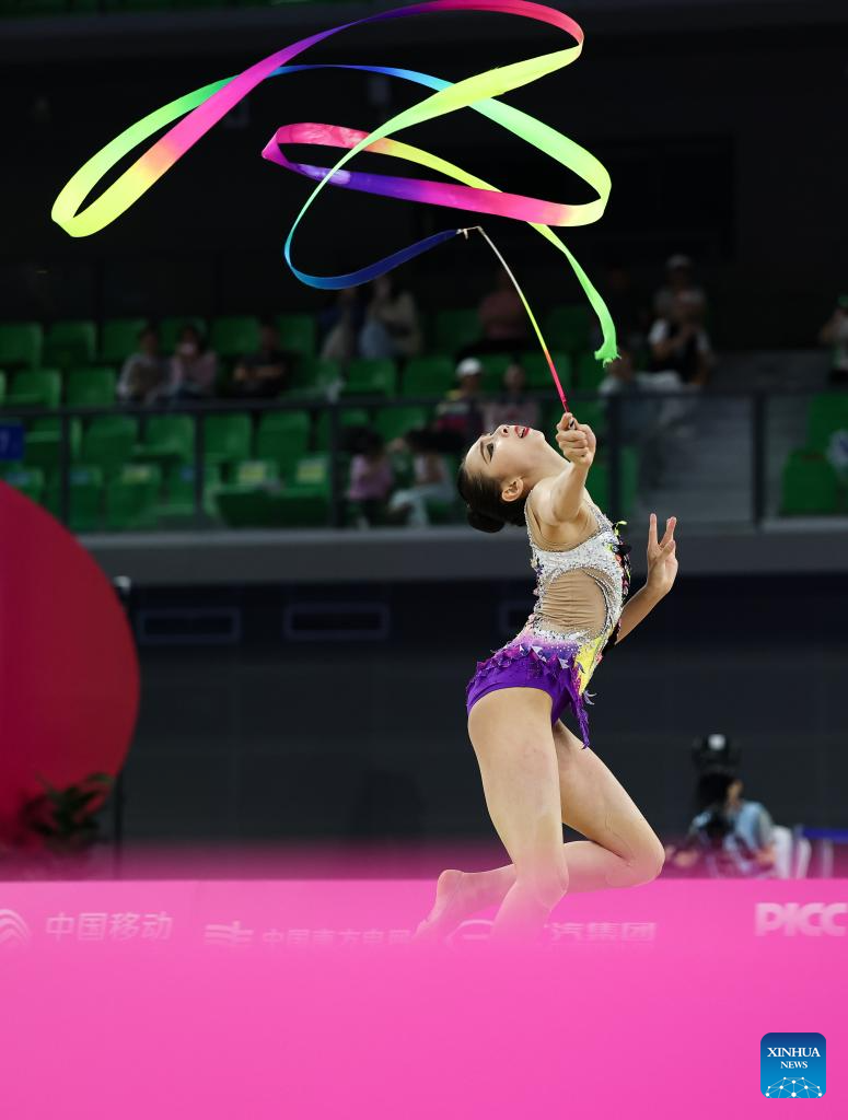 Wang Qi of Tianjin performs during the ribbon event of the individual all-around final of rhythmic gymnastics at China's 15th National Games in Shenzhen, south China's Guangdong Province, Nov. 10, 2025. (Xinhua/Mao Maosiqian)