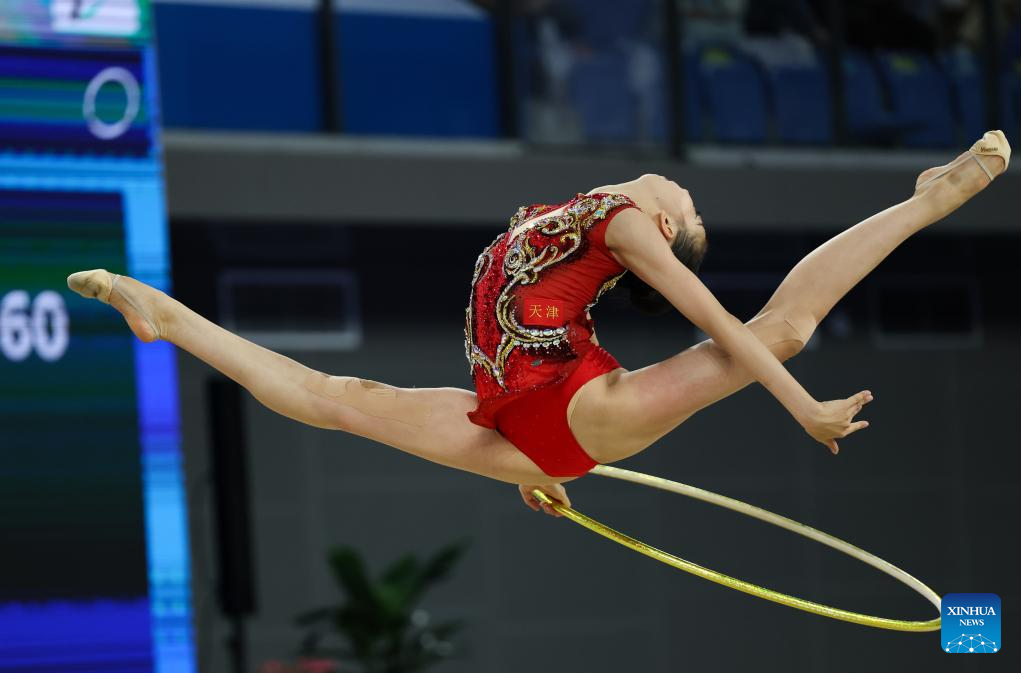 Wang Qi of Tianjin performs during the hoop event of the individual all-around final of rhythmic gymnastics at China's 15th National Games in Shenzhen, south China's Guangdong Province, Nov. 10, 2025. (Xinhua/Mao Maosiqian)