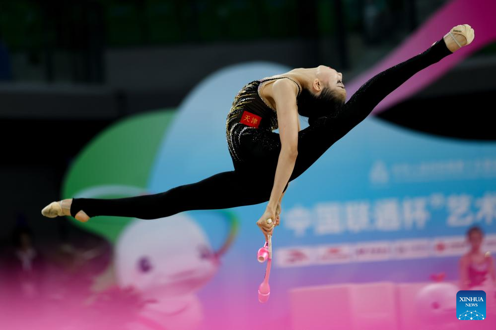 Wang Qi of Tianjin performs during the clubs event of the individual all-around final of rhythmic gymnastics at China's 15th National Games in Shenzhen, south China's Guangdong Province, Nov. 10, 2025. (Xinhua/Mao Maosiqian)