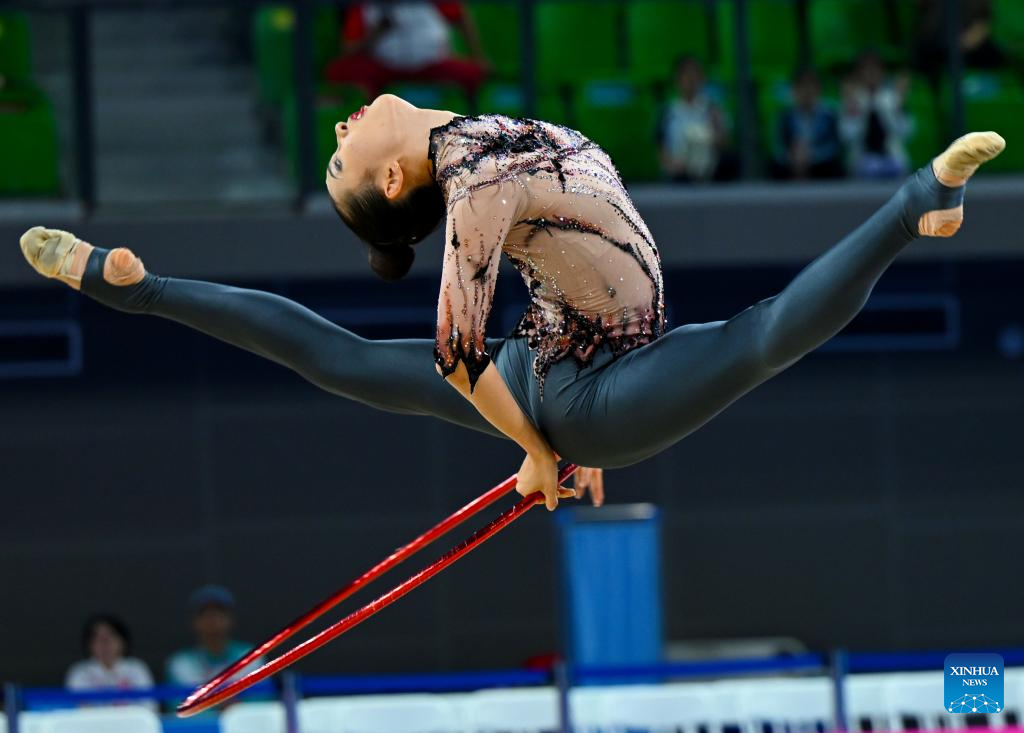 Wang Zilu of Shaanxi performs during the hoop event of the individual all-around final of rhythmic gymnastics at China's 15th National Games in Shenzhen, south China's Guangdong Province, Nov. 10, 2025. (Xinhua/Hao Yuan)