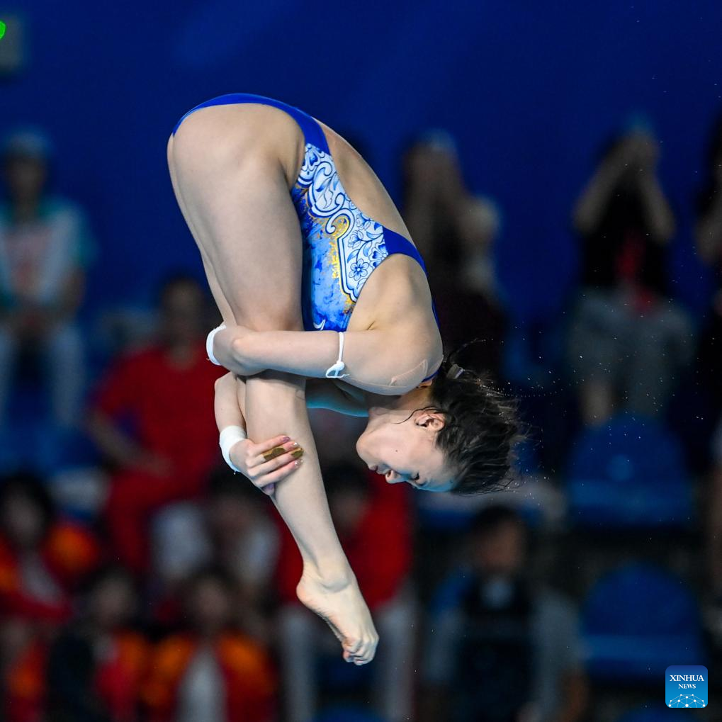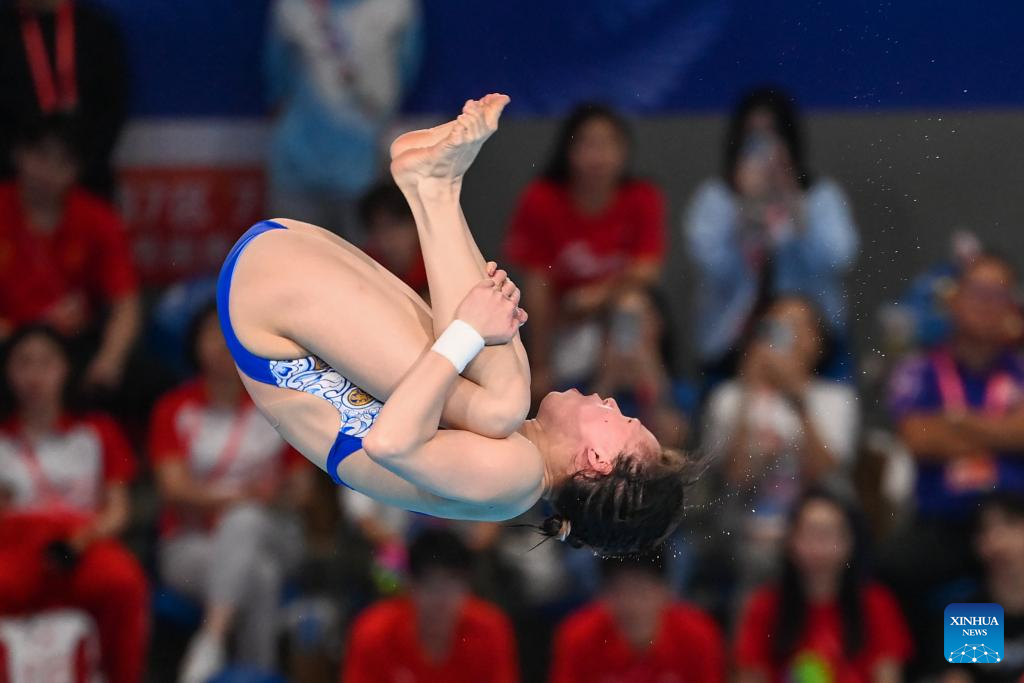 Chen Yuxi of Shanghai competes during the women's 10m platform final of diving at China's 15th National Games in Guangzhou, south China's Guangdong Province, Nov. 10, 2025. (Xinhua/Tang Yi)