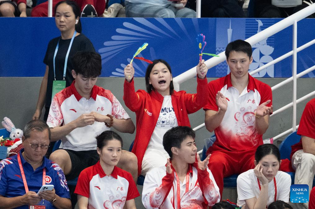 Quan Hongchan (back C) is seen during the women's 10m platform final of diving at China's 15th National Games in Guangzhou, south China's Guangdong Province, Nov. 10, 2025. (Xinhua/Xiao Yijiu)