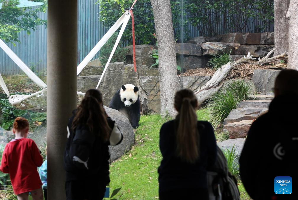 Tourists look at giant panda Yilan at Adelaide Zoo in Adelaide, Australia, Nov. 10, 2025. The giant panda pair Xingqiu, a male, and Yilan, a female, arrived in Adelaide on Dec. 15, 2024. According to the contract, they will spend ten years at Adelaide Zoo, replacing the pair Wangwang and Funi who returned to China last November after 15 years in Australia. (Xinhua/Ma Ping)