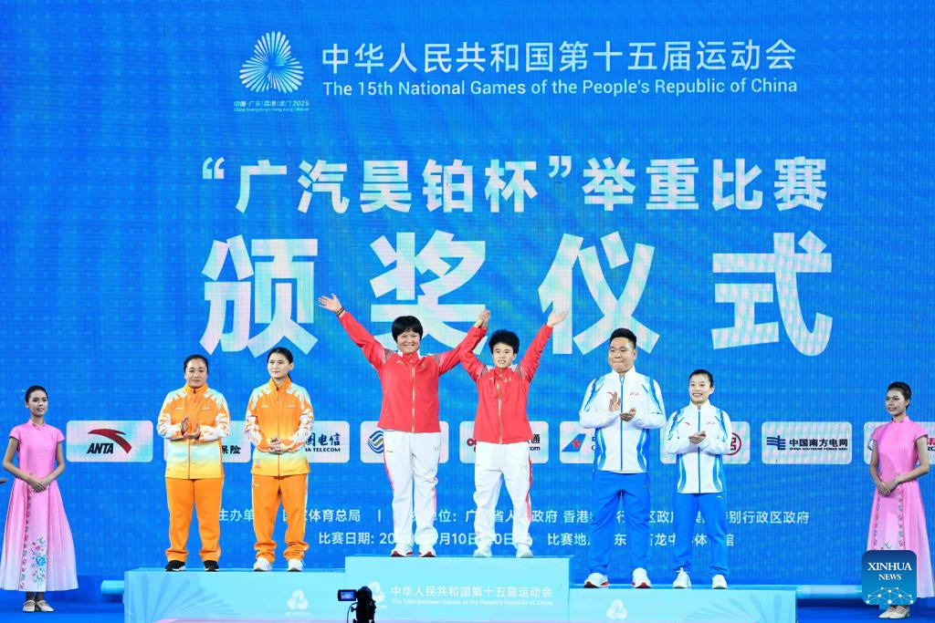Gold medalist Zhao Jinlan of Guangxi, silver medalist Zhao Jinhong of Guangxi and bronze medalist Chen Yarou of Shaanxi pose during the awarding ceremony for the weightlifting women's 45kg final at China's 15th National Games in Dongguan, south China's Guangdong Province, Nov. 10, 2025. (Xinhua/Yang Chenguang)