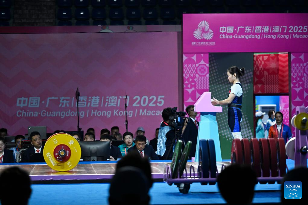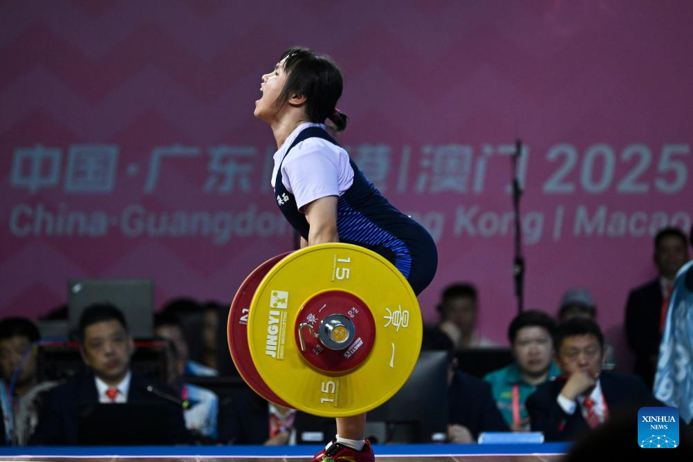 Deng Xiaofang of Hainan competes in clean and jerk during the weightlifting women's 49kg final at China's 15th National Games in Dongguan, south China's Guangdong Province, Nov. 10, 2025. (Xinhua/Yang Chenguang)