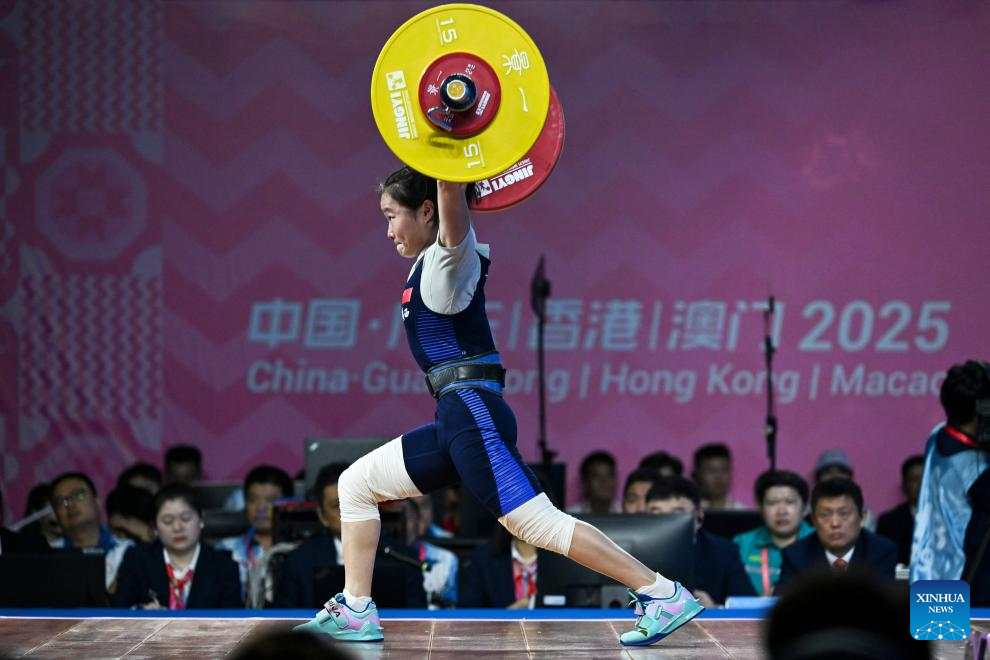 Hou Zhihui of Hunan competes in snatch during the weightlifting women's 49kg final at China's 15th National Games in Dongguan, south China's Guangdong Province, Nov. 10, 2025. (Xinhua/Yang Chenguang)