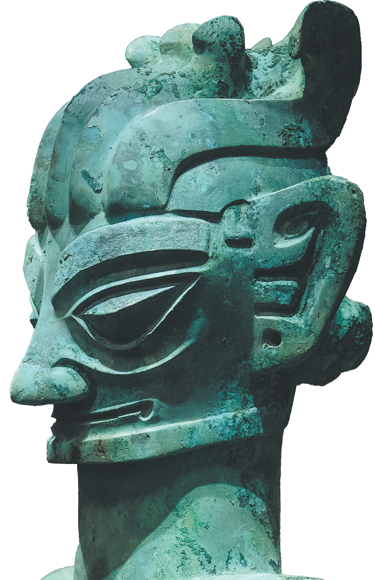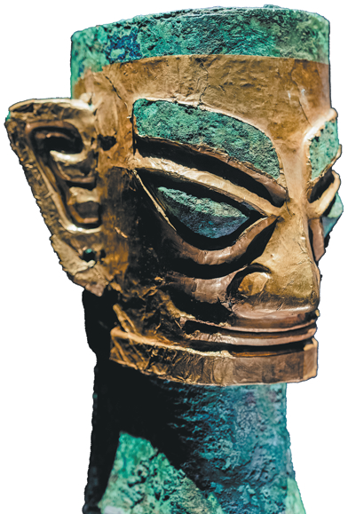A bronze head statue with a gold mask, one of the most dazzling discoveries at the Sanxingdui site, in Guanghan, Sichuan province. CHINA DAILY