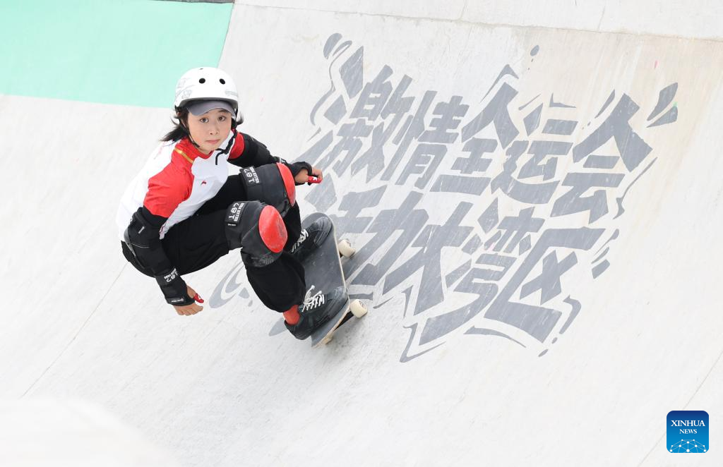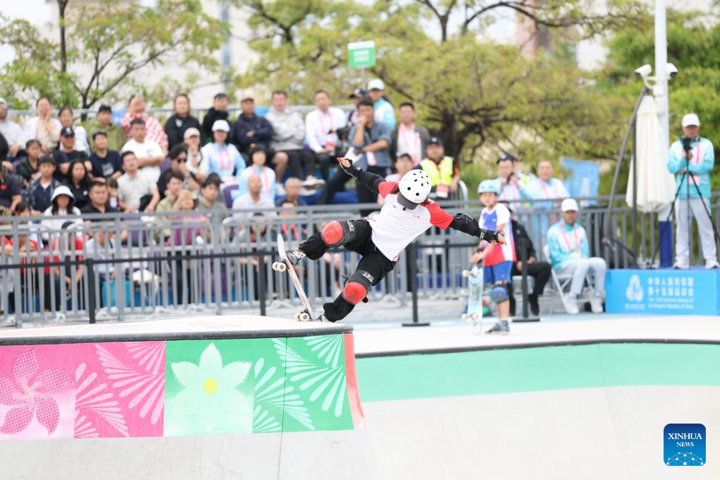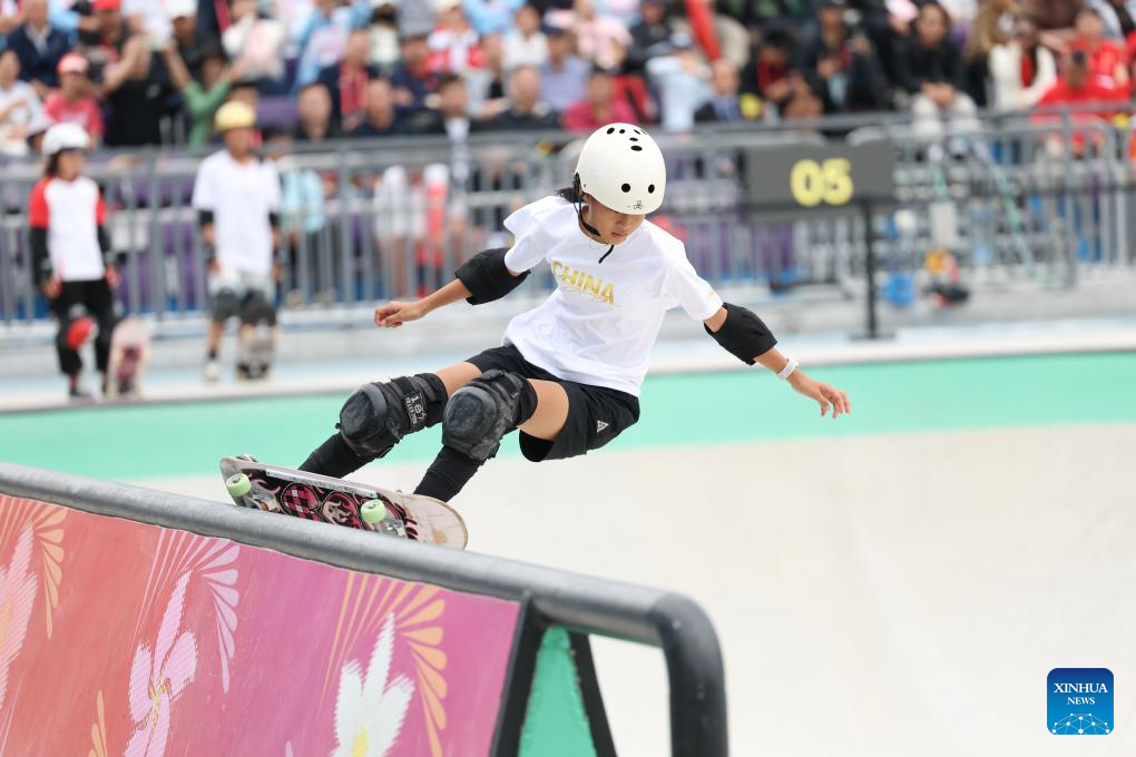 Zou Mingke of Guangdong competes during the women's park final of skateboarding at China's 15th National Games in Huizhou, south China's Guangdong Province, Nov. 11, 2025. (Xinhua/Lu Hanxin)