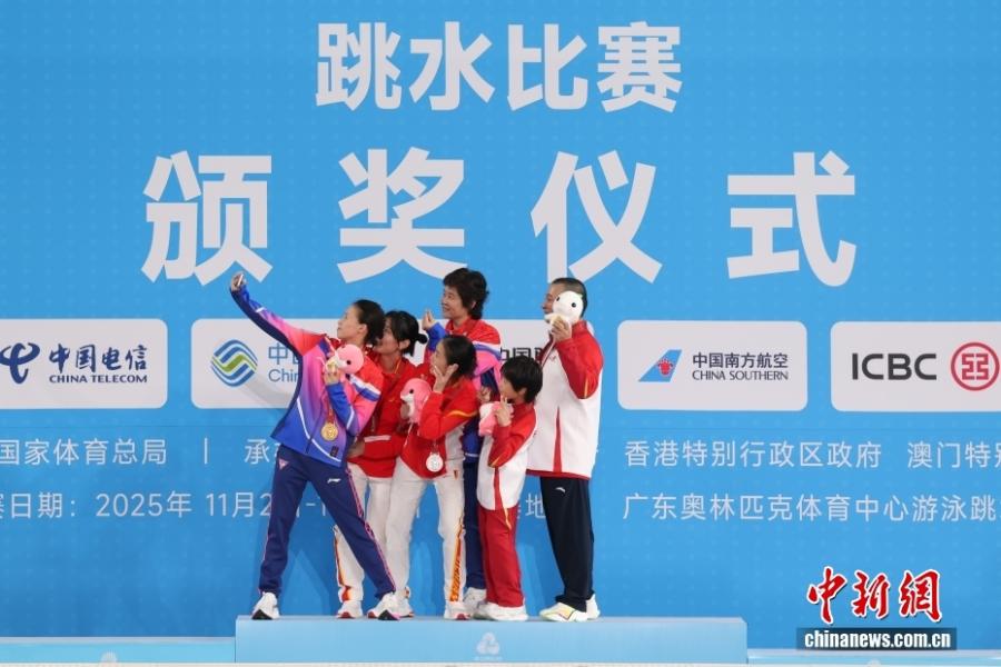 Gold medalist Chen Yuxi of Shanghai, silver medalist Lu Wei of Sichuan, bronze medalist Liu Zihan of Shandong and their coaches take a selfie during the awarding ceremony for the women's 10m platform of diving at China's 15th National Games in Guangzhou, south China's Guangdong Province, Nov. 10, 2025. (Photo: China News Service/Chen Chuhong)