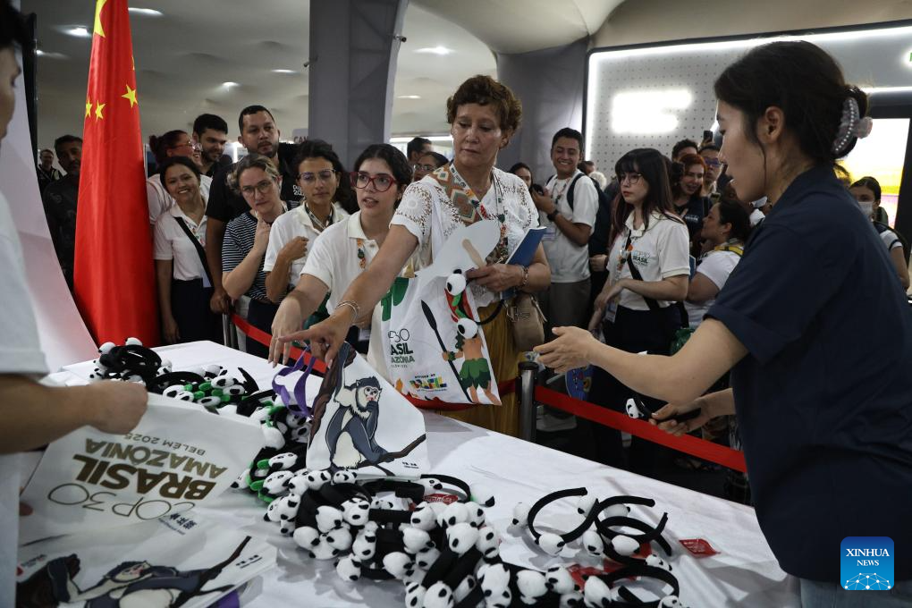 Participants get souvenirs at the China Pavilion during the 30th UN Climate Change Conference (COP30) in Belem, Brazil, Nov. 10, 2025. On Monday, the "China Pavilion" series of the COP30 side events kicked off in Belem, with the first session focusing on ecological civilization and the practice of building a "Beautiful China."