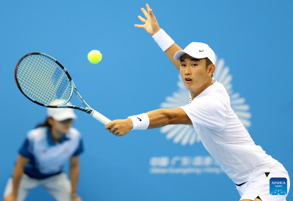 Zhou Yi of Guangxi competes against Shang Juncheng of Beijing during the junior men's team semifinal match between Beijing and Guangxi at China's 15th National Games in Hengqin, south China's Guangdong Province, Nov. 11, 2025. (Xinhua/Zhang Chenlin)