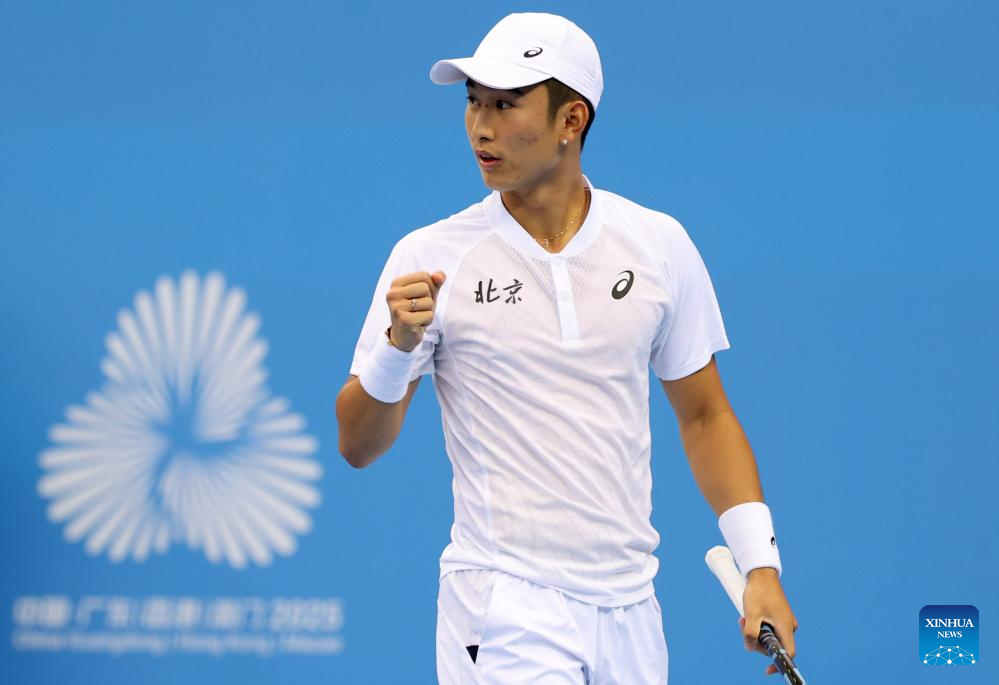 Shang Juncheng of Beijing reacts in the match against Zhou Yi of Guangxi during the junior men's team semifinal match between Beijing and Guangxi at China's 15th National Games in Hengqin, south China's Guangdong Province, Nov. 11, 2025. (Xinhua/Zhang Chenlin)