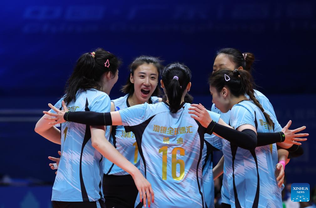 Players of team Tianjin celebrate during women's volleyball group A match between Tianjin and Sichuan at China's 15th National Games in Macao, south China, Nov. 11, 2025. (Xinhua/Sun Fanyue)