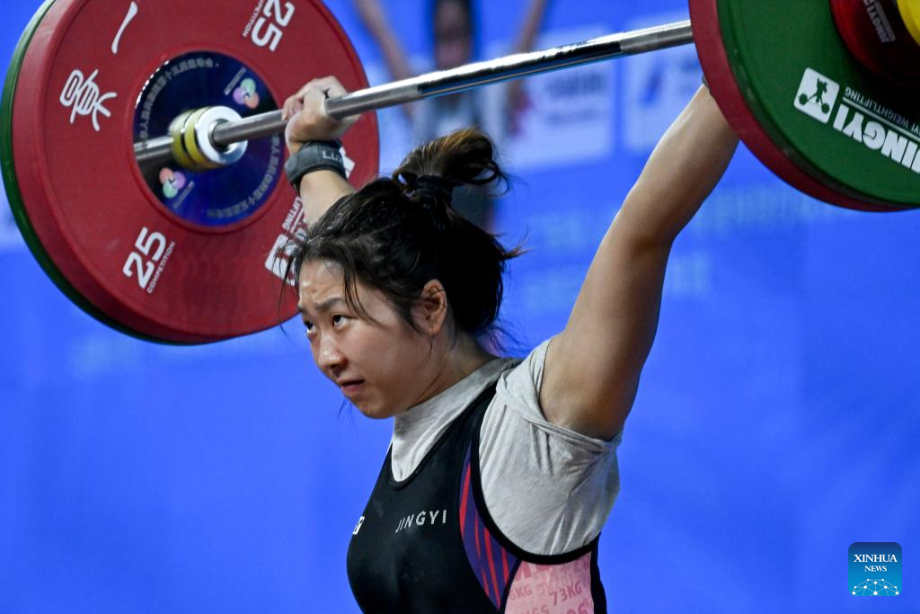 Wei Tingna of Fujian competes in snatch during the weightlifting women's 55kg final at China's 15th National Games in Dongguan, south China's Guangdong Province, Nov. 11, 2025. (Xinhua/Yang Chenguang)