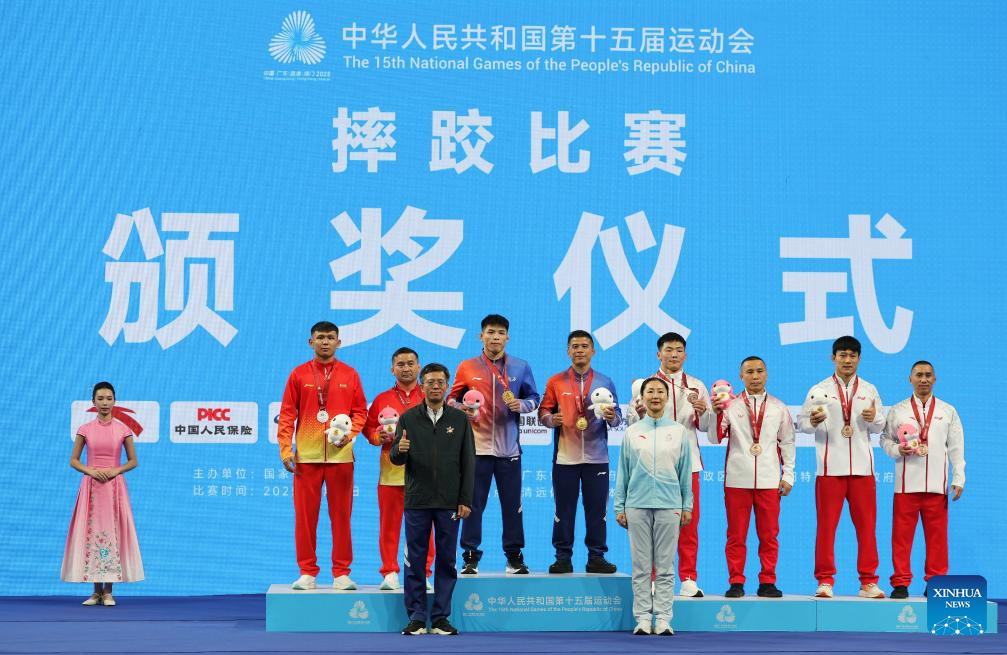 Gold medalist Lu Feng of Guangxi, silver medalist Aheiyou Tuerxun of Xinjiang, bronze medalist Batuqinggele of Inner Mongolia and bronze medalist Jin Wenmeng of Yunnan pose with their coaches during the awarding ceremony after the men's freestyle 74kg of wrestling at China's 15th National Games in Qingyuan, south China's Guangdong Province, Nov. 11, 2025. (Xinhua/Li Ran)