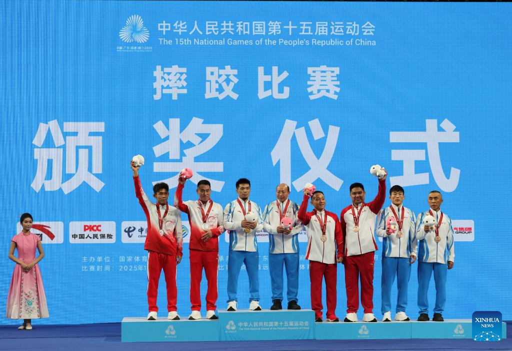 Gold medalist Yuan Shaohua of Zhejiang, silver medalist Ou Xuexian of Guangdong, bronze medalist Zheng Chao of Shandong and bronze medalist Wang Siming of Zhejiang pose with their coaches during the awarding ceremony after the men's freestyle 65kg of wrestling at China's 15th National Games in Qingyuan, south China's Guangdong Province, Nov. 11, 2025. (Xinhua/Li Ran)