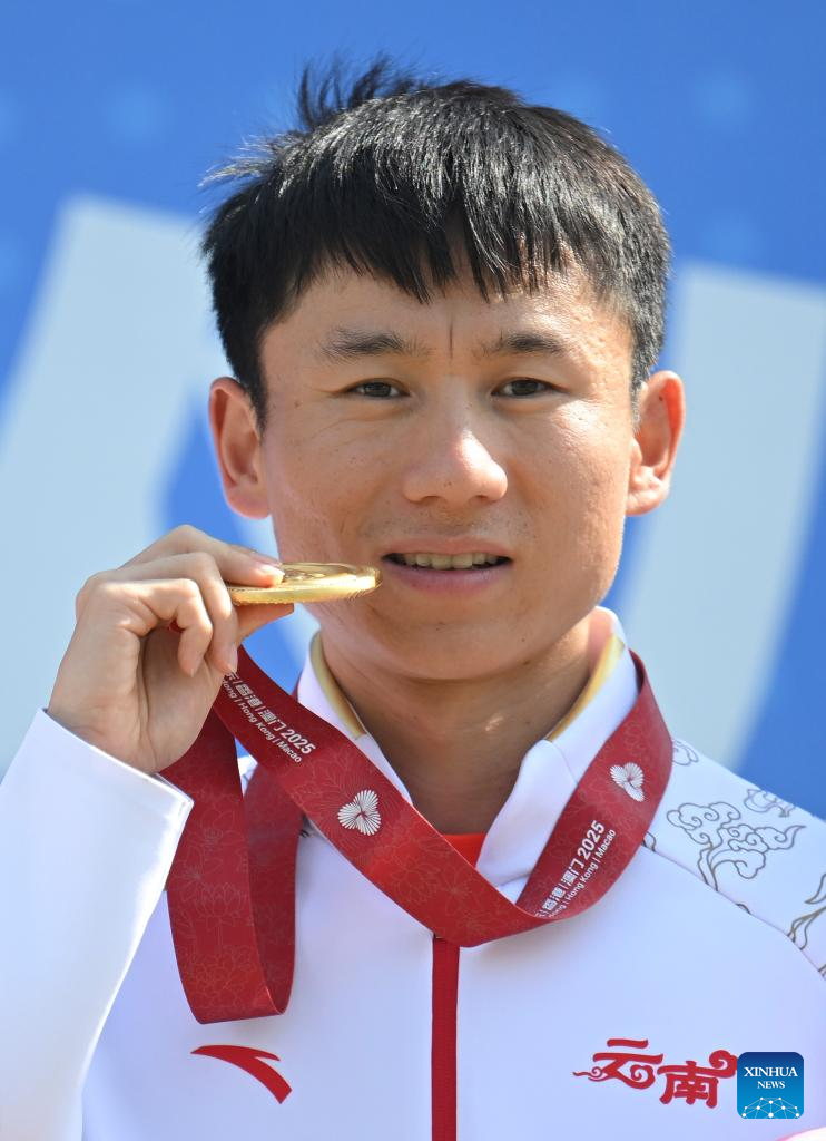 Gold medalist Zhang Jun of Yunnan reacts during the awarding ceremony for the men's 20km race walk of athletics at China's 15th National Games in Zhuhai, south China's Guangdong Province, Nov. 12, 2025. (Xinhua/Zhang Long)