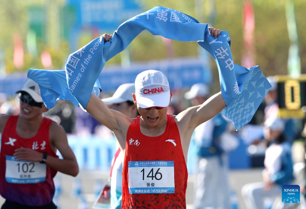 Zhang Jun of Yunnan celebrates after crossing the finish line during the men's 20km race walk final at China's 15th National Games in Zhuhai, south China's Guangdong Province, Nov. 12, 2025. (Xinhua/Mao Siqian)