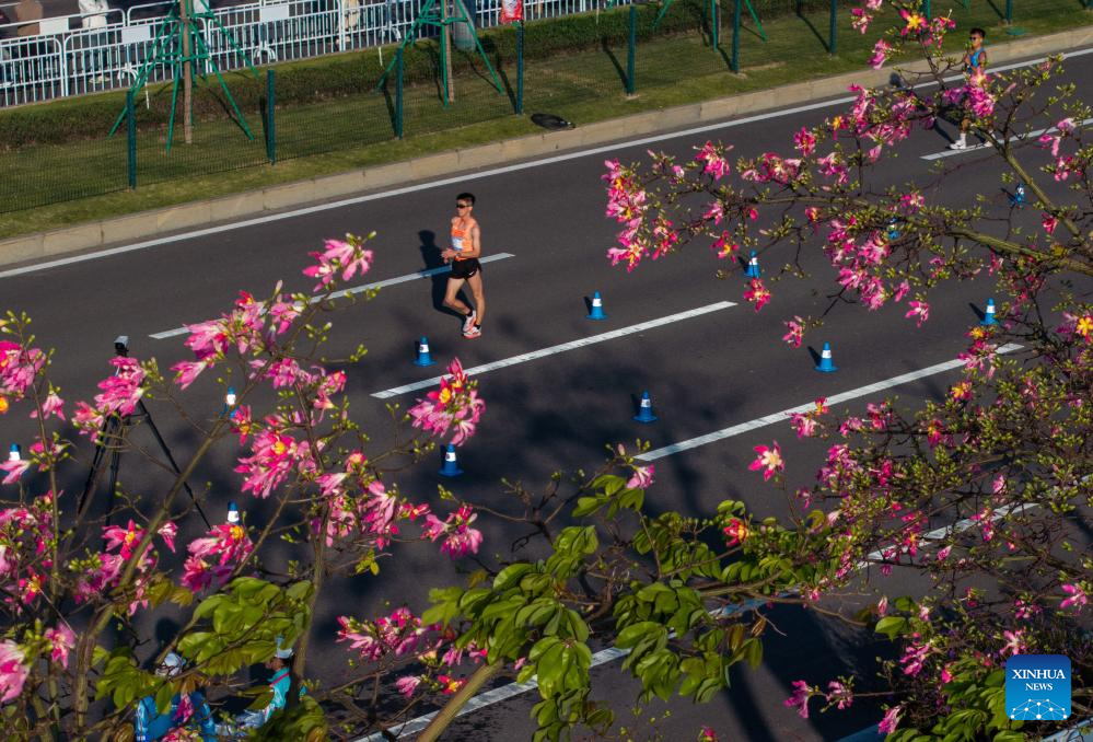Athletes compete during the men's 20km race walk of athletics at China's 15th National Games in Zhuhai, south China's Guangdong Province, Nov. 12, 2025. (Xinhua/Zhang Long)