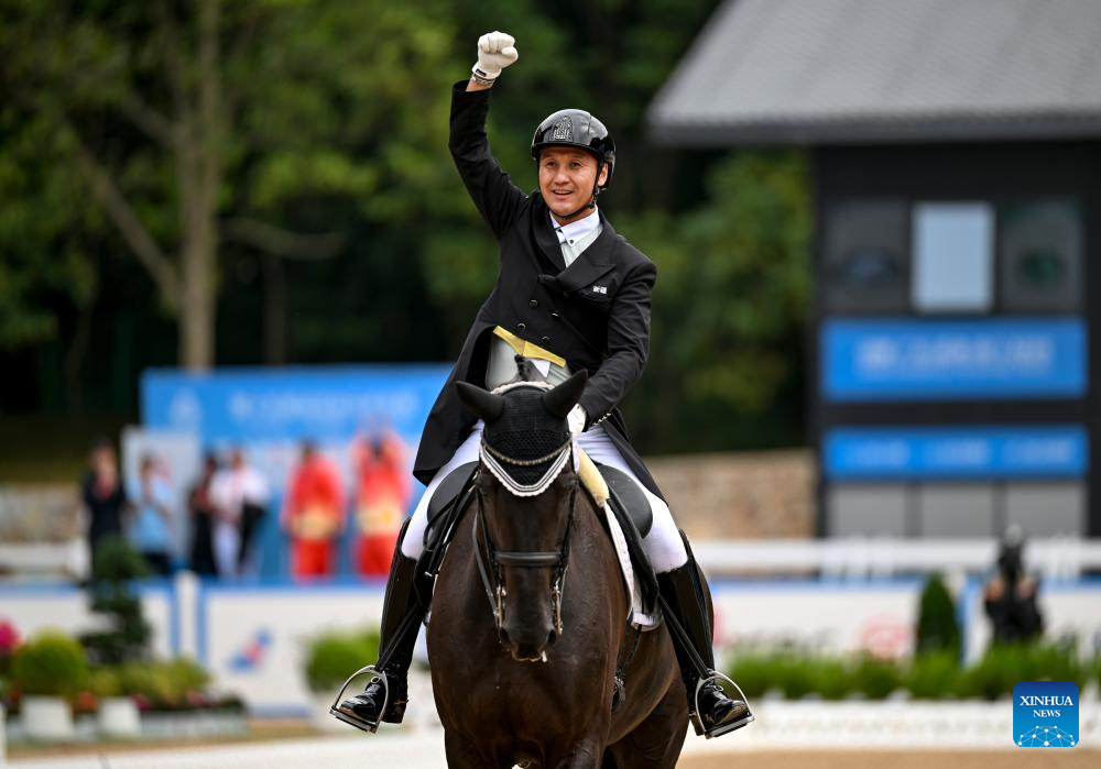 Gold medalist Liu Tao of Xinjiang celebrates after winning the equestrian dressage individual final at China's 15th National Games in Shenzhen, south China's Guangdong Province, Nov. 12, 2025. (Xinhua/Feng Kaihua)