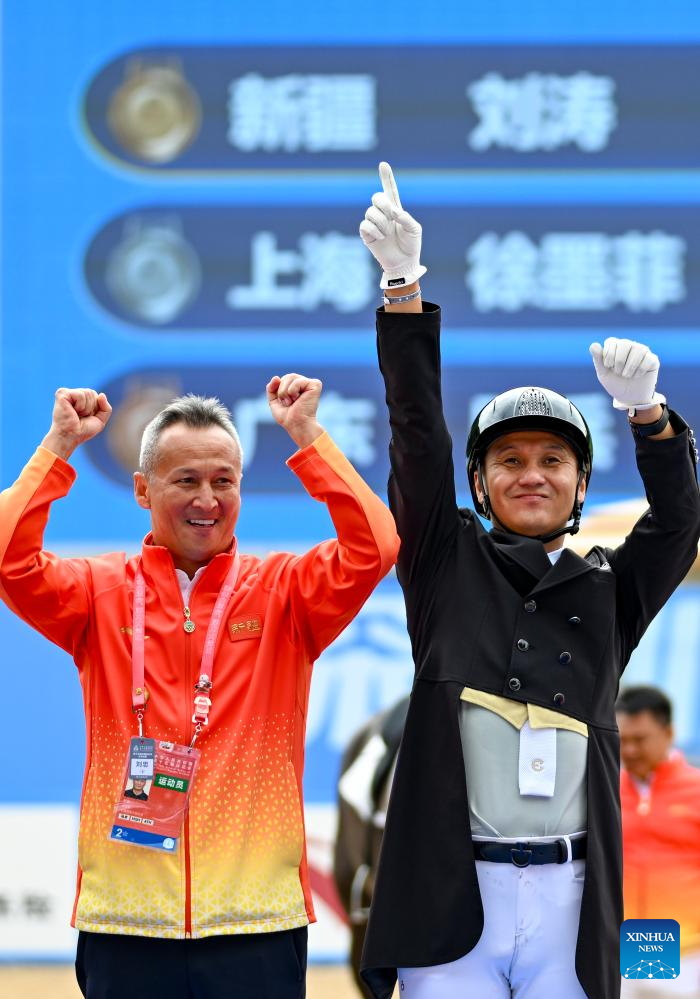 Gold medalist Liu Tao (R) of Xinjiang celebrates with his coach during the awarding ceremony for the equestrian dressage individual final at China's 15th National Games in Shenzhen, south China's Guangdong Province, Nov. 12, 2025. (Xinhua/Feng Kaihua)
