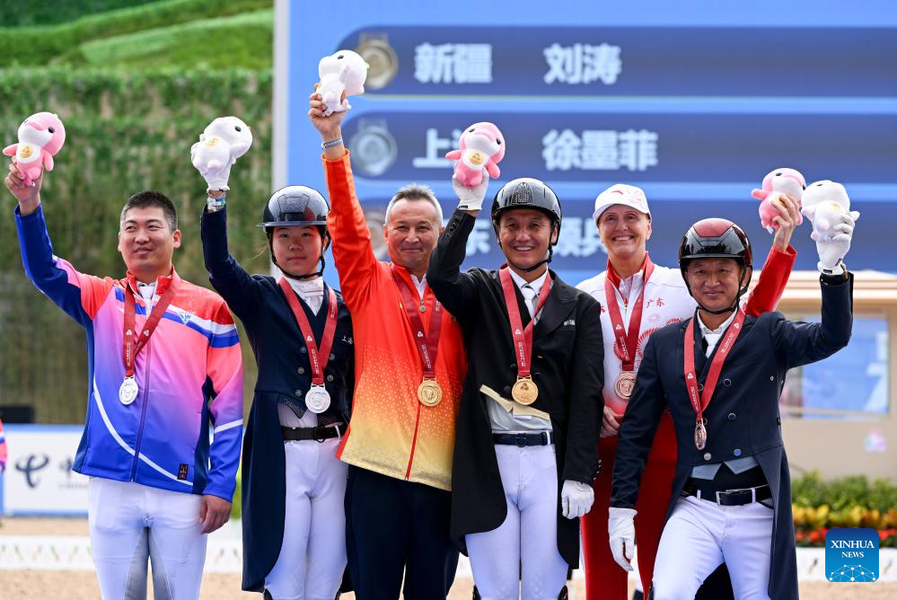 Gold medalist Liu Tao (3nd R) of Xinjiang, silver medalist Xu Mofei (2nd L) of Shanghai and bronze medalist Gu Bing (1st R) of Guangdong pose with their coaches during the awarding ceremony for the equestrian dressage individual final at China's 15th National Games in Shenzhen, south China's Guangdong Province, Nov. 12, 2025. (Xinhua/Feng Kaihua)