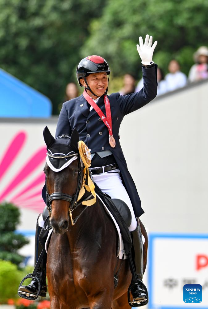 Bronze medalist Gu Bing of Guangdong greets the spectators after winning the equestrian dressage individual final at China's 15th National Games in Shenzhen, south China's Guangdong Province, Nov. 12, 2025. (Xinhua/Feng Kaihua)