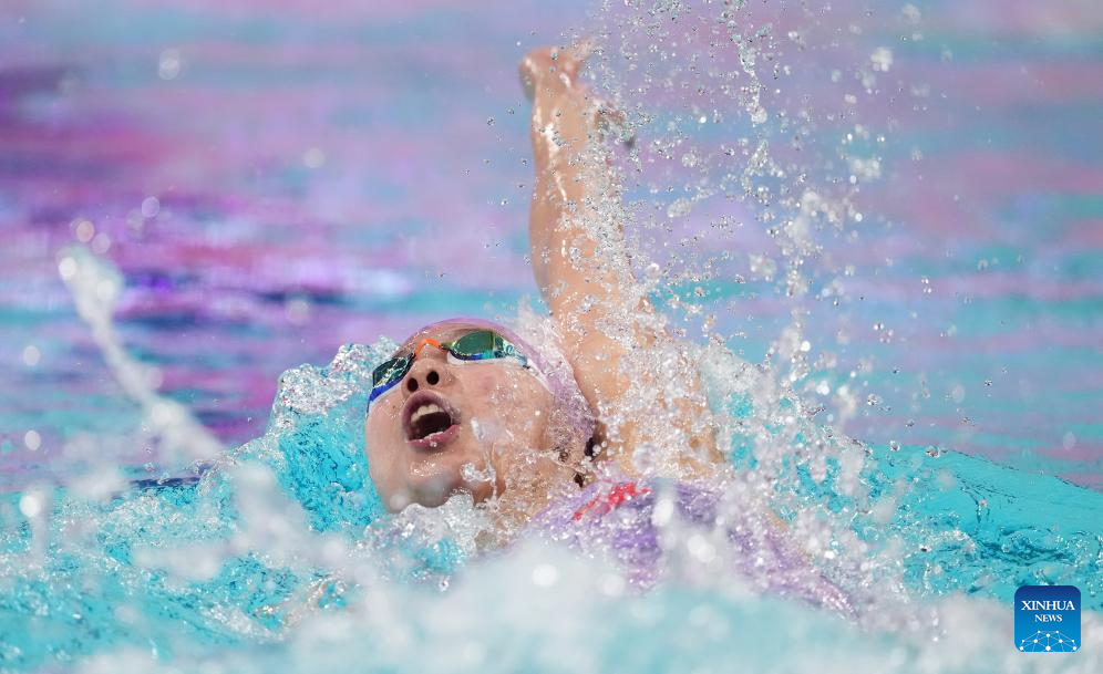 Peng Xuwei of Hubei competes during the women's 100m backstroke final of swimming at China's 15th National Games in Shenzhen, south China's Guangdong Province, Nov. 12, 2025. (Xinhua/Xue Yuge)