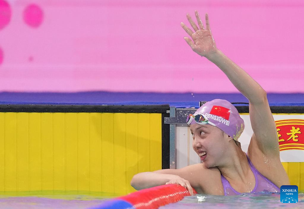 Peng Xuwei of Hubei reacts after the women's 100m backstroke final of swimming at China's 15th National Games in Shenzhen, south China's Guangdong Province, Nov. 12, 2025. (Xinhua/Xue Yuge)