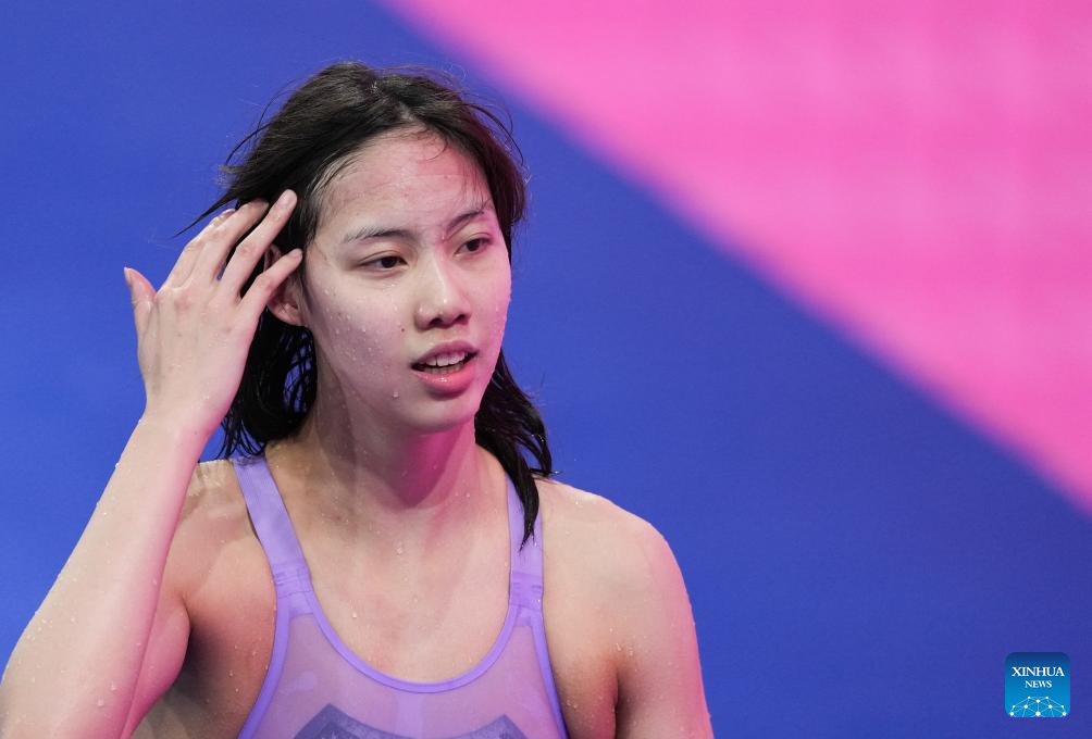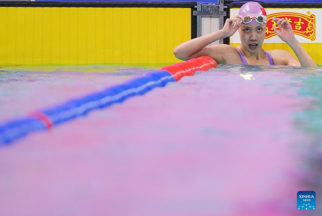 Li Bingjie of Hebei is seen after the women's 1500m freestyle final of swimming at China's 15th National Games in Shenzhen, south China's Guangdong Province, Nov. 12, 2025. (Xinhua/Xue Yuge)
