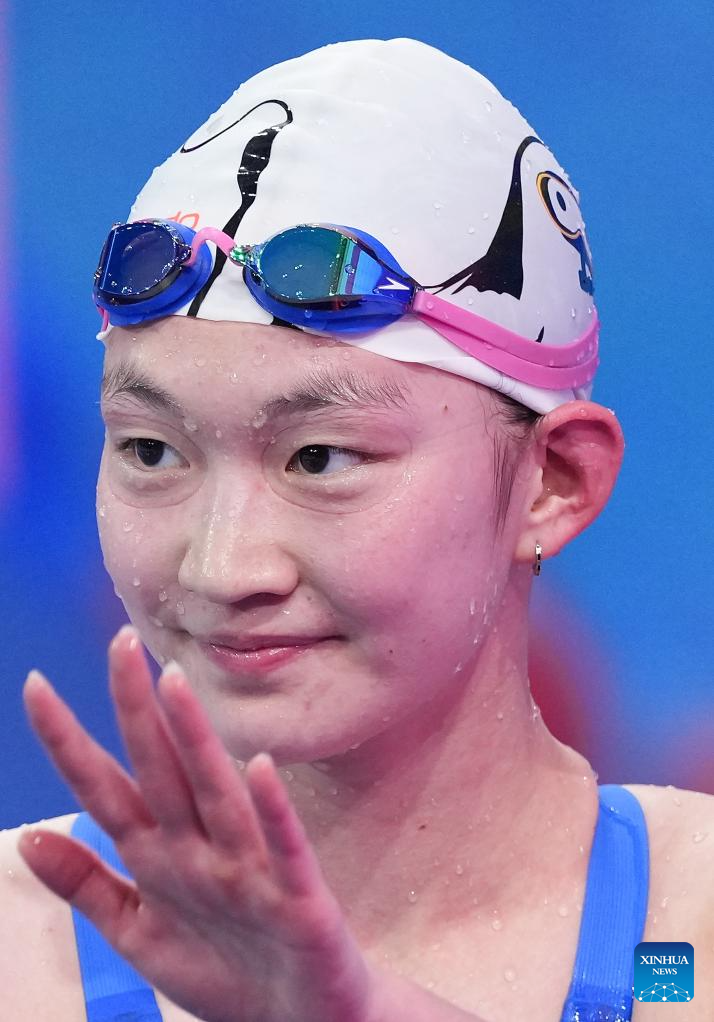 Li Bingjie of Hebei greets the spectators after the women's 1500m freestyle final of swimming at China's 15th National Games in Shenzhen, south China's Guangdong Province, Nov. 12, 2025. (Xinhua/Du Yu)