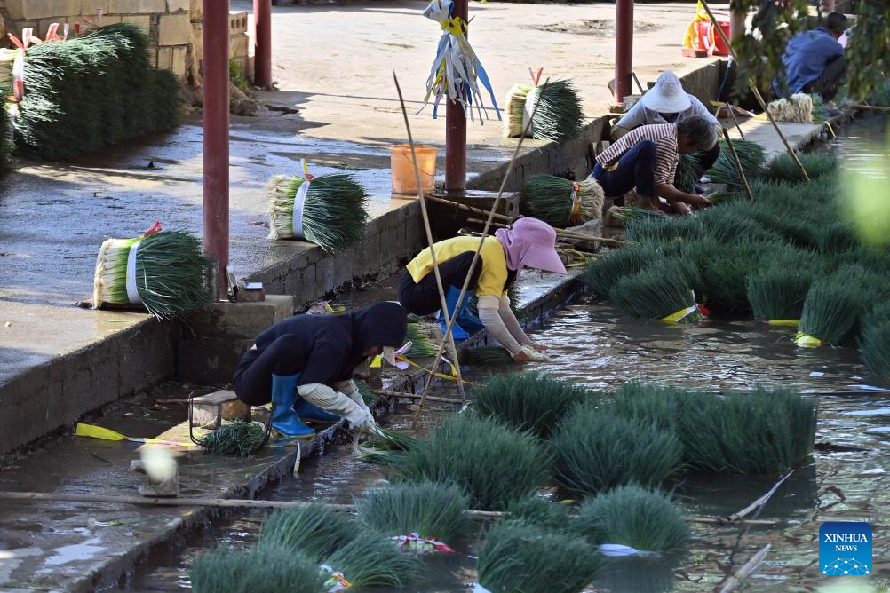 Villagers clean harvested chives in Jueshan Village of Sandu Town in Liuzhou City, south China's Guangxi Zhuang Autonomous Region, Oct. 28, 2025. Sandu Town has in recent years promoted the standardized and industrialized production of chives, and developed an integrated business system that ranges from planting and processing to sales and service. (Xinhua/Huang Xiaobang)
