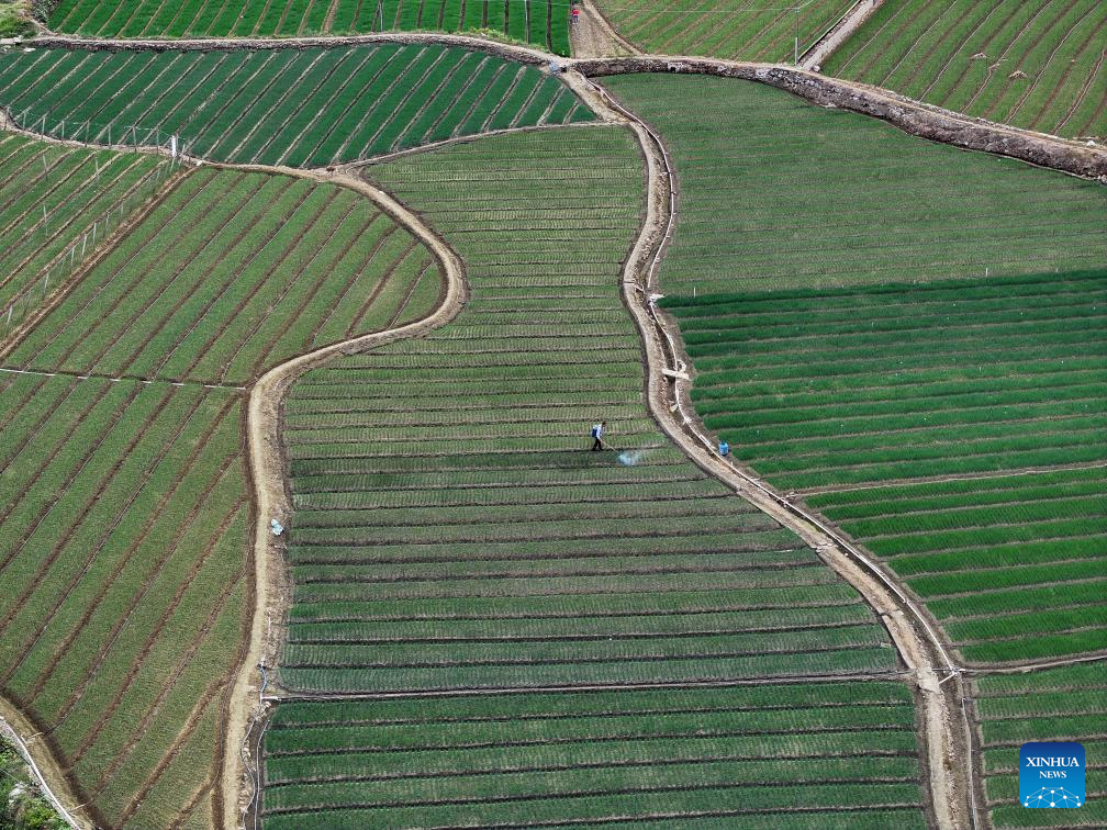 An aerial drone photo taken on Nov. 11, 2025 shows villagers taking care of chives in Jueshan Village of Sandu Town in Liuzhou City, south China's Guangxi Zhuang Autonomous Region. Sandu Town has in recent years promoted the standardized and industrialized production of chives, and developed an integrated business system that ranges from planting and processing to sales and service. (Xinhua/Huang Xiaobang)