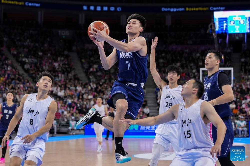 Lin Xiaotian (2nd L) of Zhejiang competes during the men's basketball final between Guangdong and Zhejiang at China's 15th National Games in Qingyuan, south China's Guangdong Province, Nov. 12, 2025. (Xinhua/Li Bo)