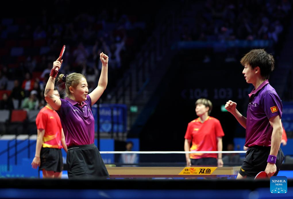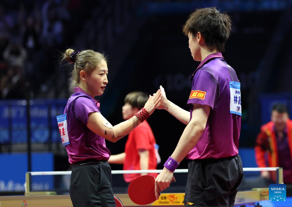 Lin Gaoyuan (L)/Liu Shiwen (R) celebrate scoring during the table tennis mixed doubles semifinal match between Lin Gaoyuan/Liu Shiwen of Guangdong and Yuan Licen/Wang Yidi of Liaoning at China's 15th National Games in Macao, south China, Nov. 13, 2025. (Xinhua/Chen Bin)