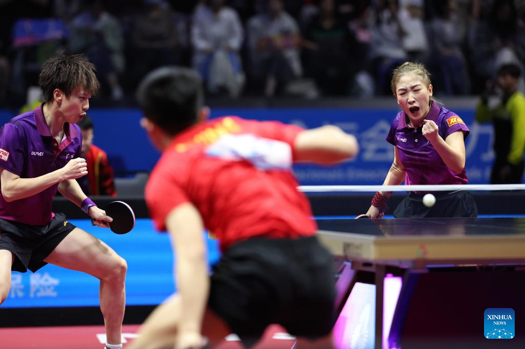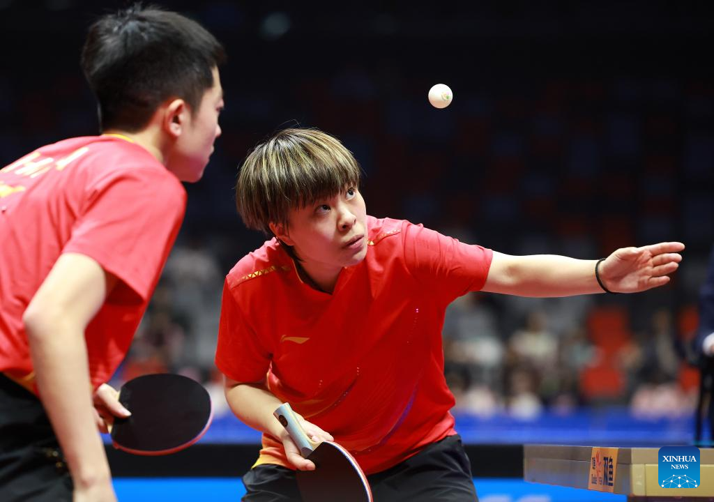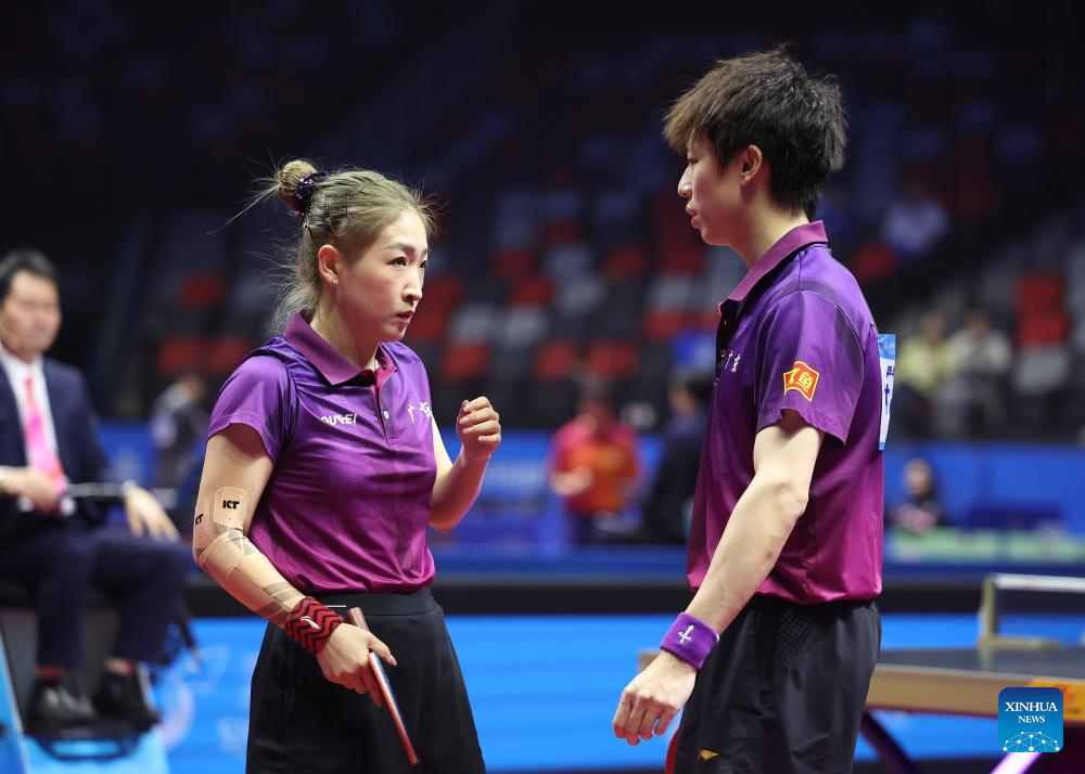 Yuan Licen/Wang Yidi (R) compete during the table tennis mixed doubles semifinal match between Lin Gaoyuan/Liu Shiwen of Guangdong and Yuan Licen/Wang Yidi of Liaoning at China's 15th National Games in Macao, south China, Nov. 13, 2025. (Xinhua/Chen Bin)