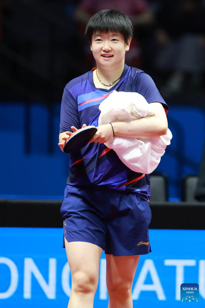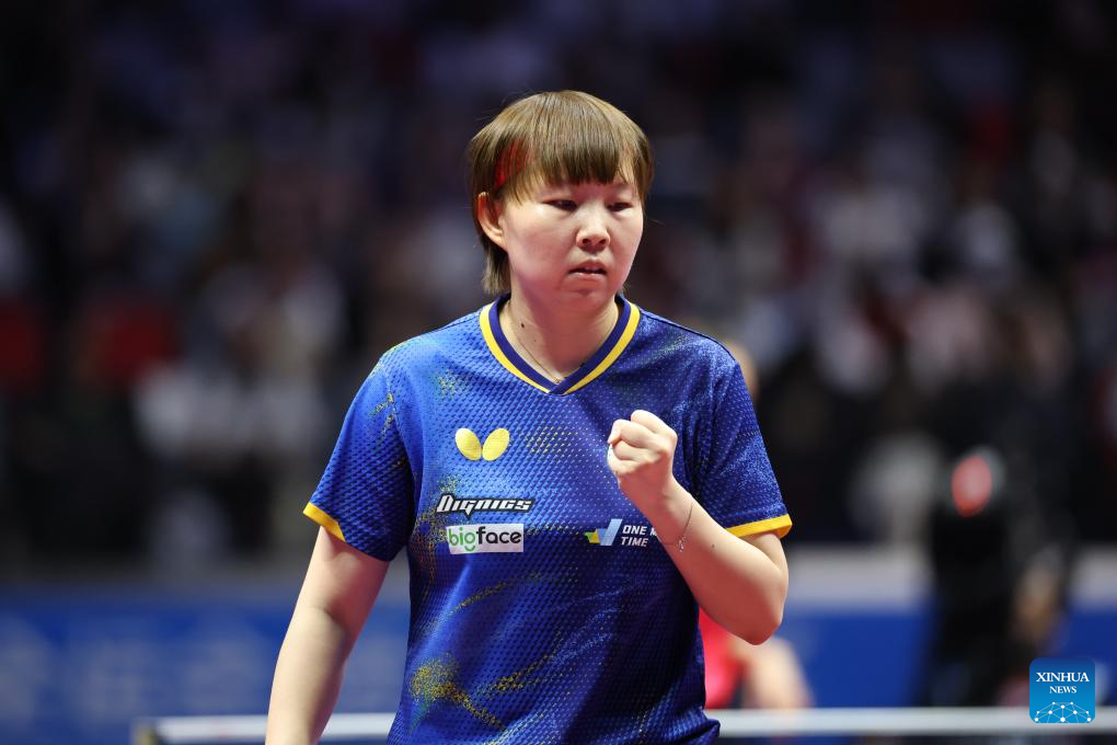 Sun Yingsha reacts during the table tennis women's singles round of 16 match between Sun Yingsha of Hebei and Wang Xiaotong of Shandong at China's 15th National Games in Macao, south China, Nov. 12, 2025. (Xinhua/Liu Xu)