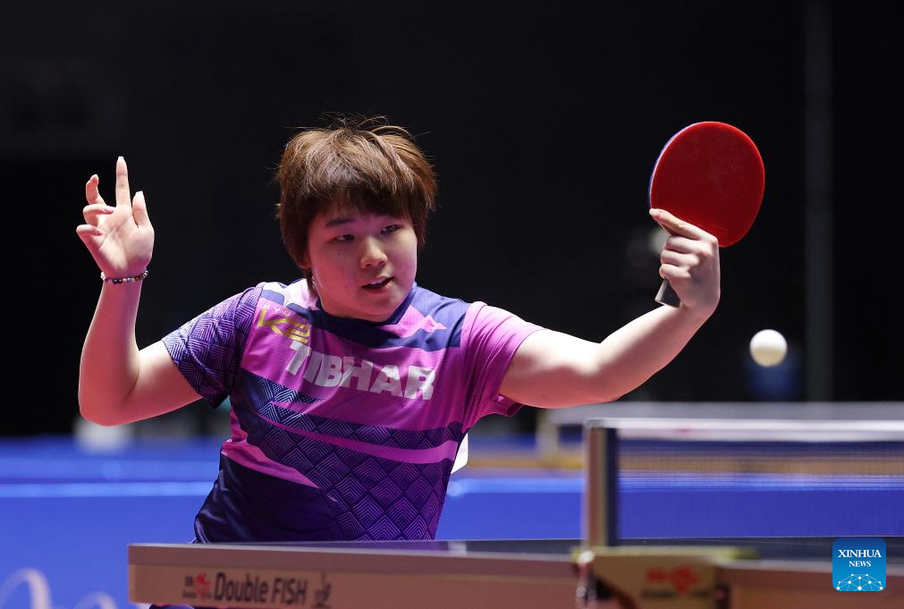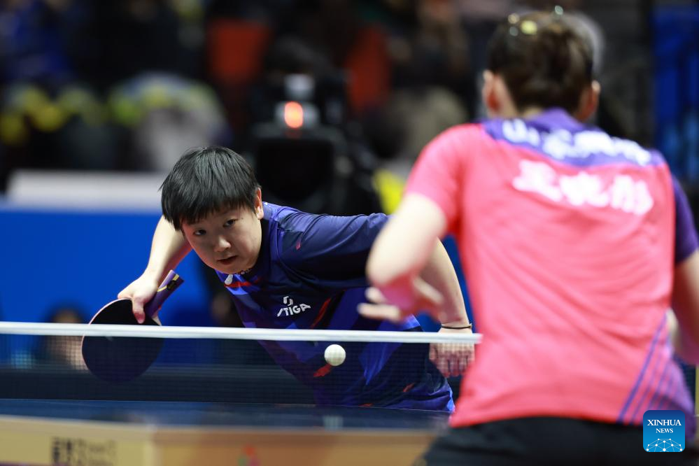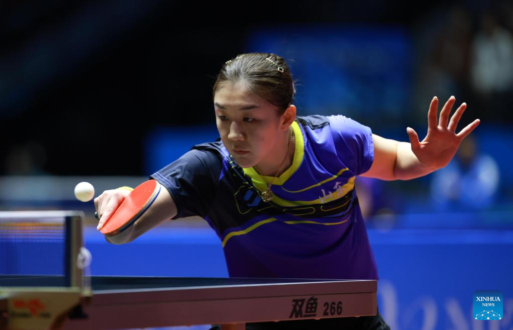 Sun Yingsha competes during the table tennis women's singles round of 16 match between Sun Yingsha of Hebei and Wang Xiaotong of Shandong at China's 15th National Games in Macao, south China, Nov. 12, 2025. (Xinhua/Liu Xu)