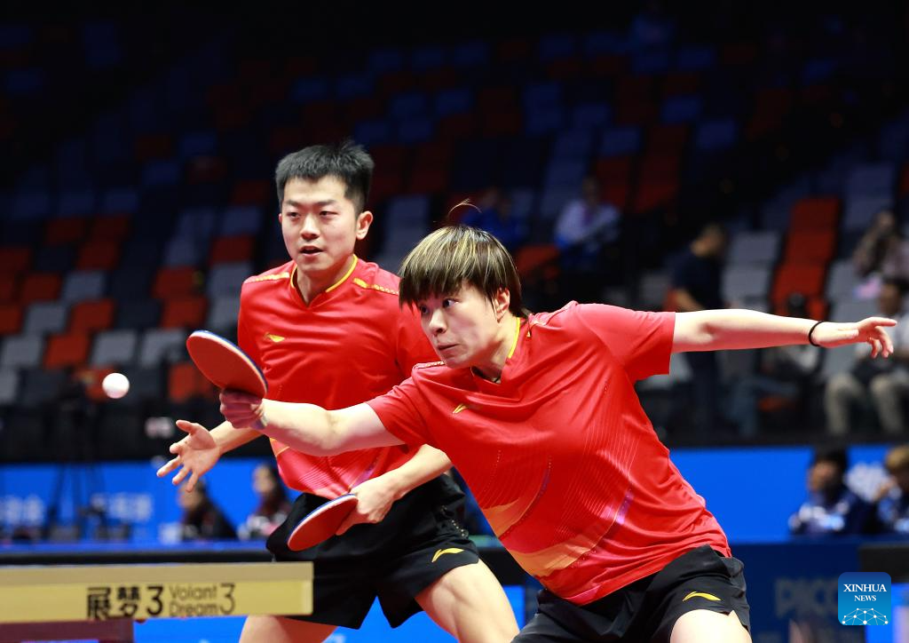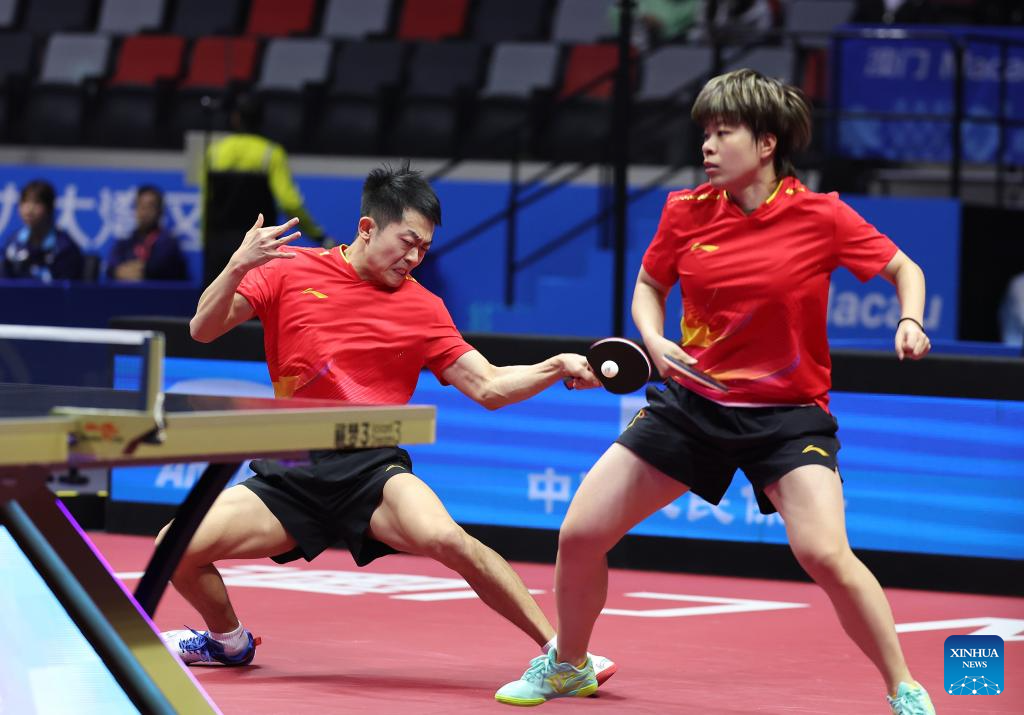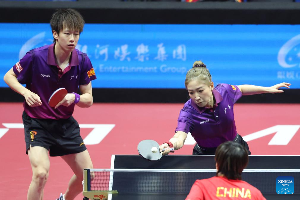Lin Gaoyuan/Liu Shiwen (front) compete during the table tennis mixed doubles semifinal match between Lin Gaoyuan/Liu Shiwen of Guangdong and Yuan Licen/Wang Yidi of Liaoning at China's 15th National Games in Macao, south China, Nov. 13, 2025. (Xinhua/Liang Xu)