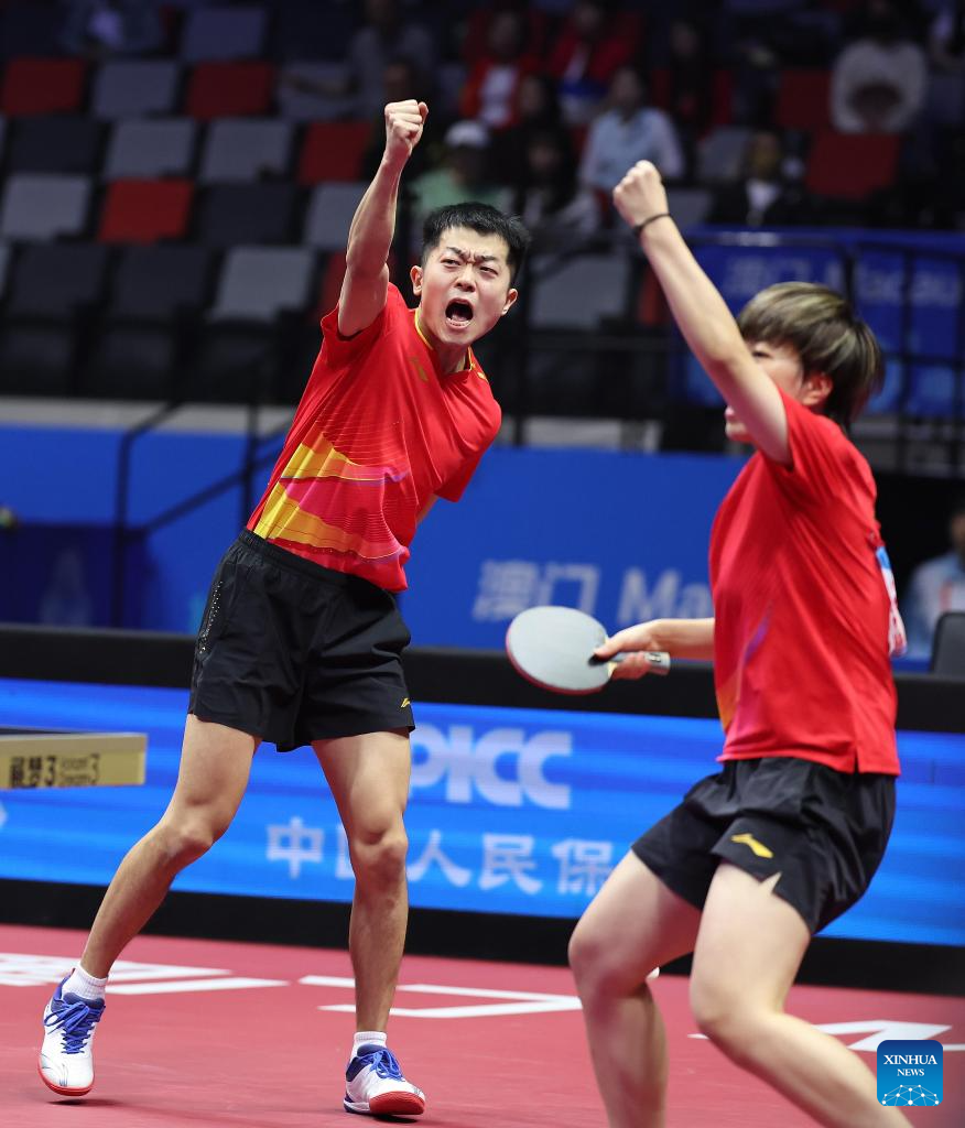 Lin Gaoyuan/Liu Shiwen (L) celebrate after winning the table tennis mixed doubles semifinal match between Lin Gaoyuan/Liu Shiwen of Guangdong and Yuan Licen/Wang Yidi of Liaoning at China's 15th National Games in Macao, south China, Nov. 13, 2025. (Xinhua/Liu Xu)