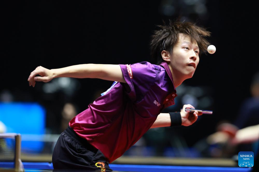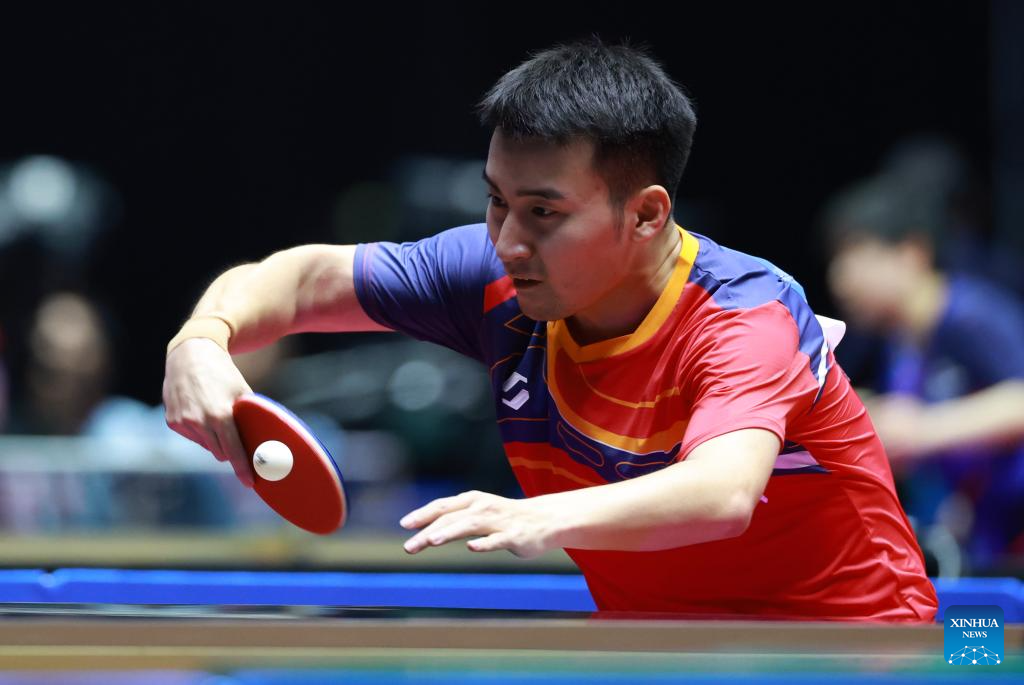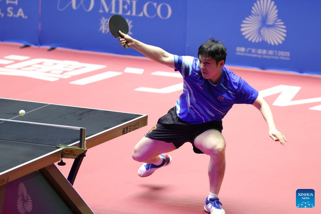 Lin Gaoyuan hits a return during the table tennis men's singles round of 16 match between Lin Gaoyuan of Guangdong and Niu Guankai of Henan at China's 15th National Games in Macao, south China, Nov. 12, 2025. (Xinhua/Liu Xu)