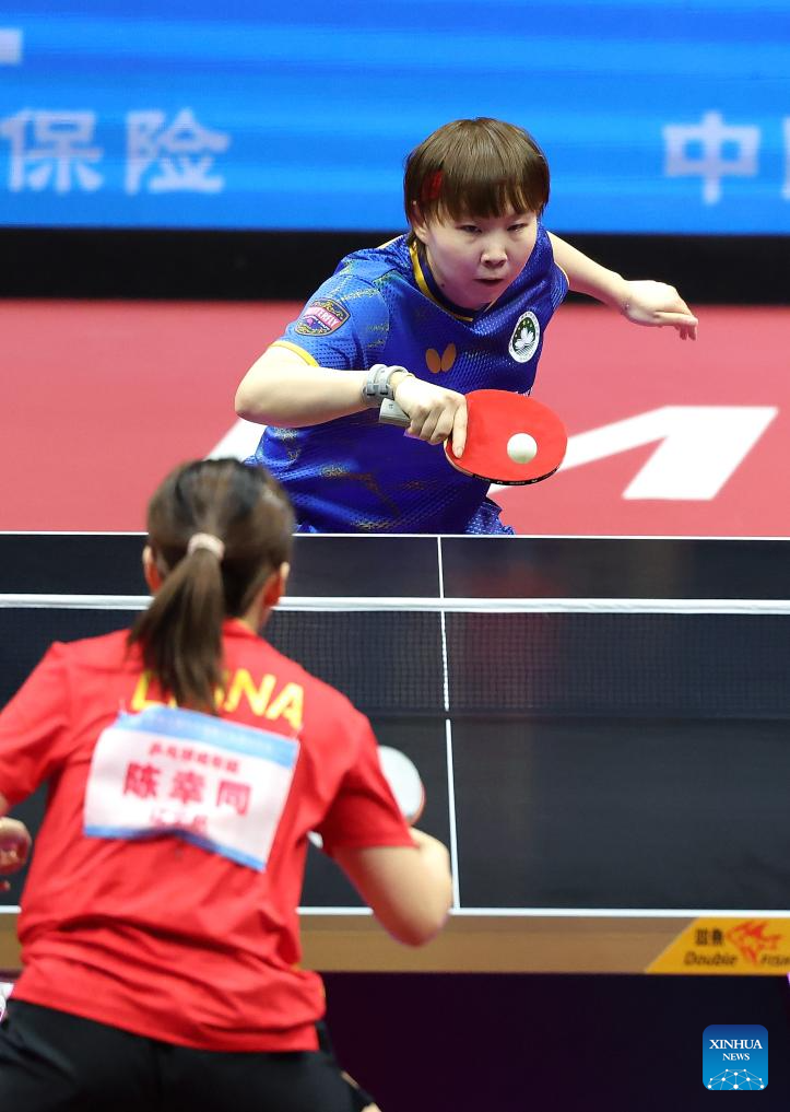 Zhu Yuling (top) hits a return during the table tennis women's singles quarterfinal match between Zhu Yuling of Macao and Chen Xingtong of Liaoning at China's 15th National Games in Macao, south China, Nov. 13, 2025. (Xinhua/Liu Xu)