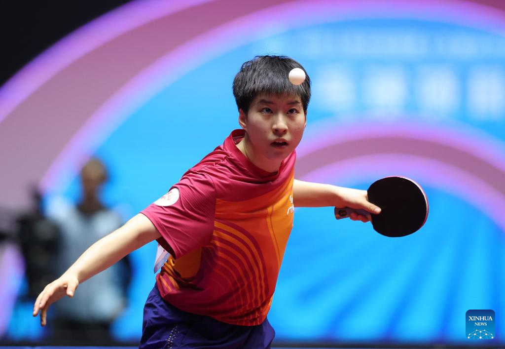 Chen Xingtong hits a return during the table tennis women's singles round of 16 match between Chen Xingtong of Liaoning and Zang Xiaotong of Hebei at China's 15th National Games in Macao, south China, Nov. 12, 2025. (Xinhua/Liu Xu)