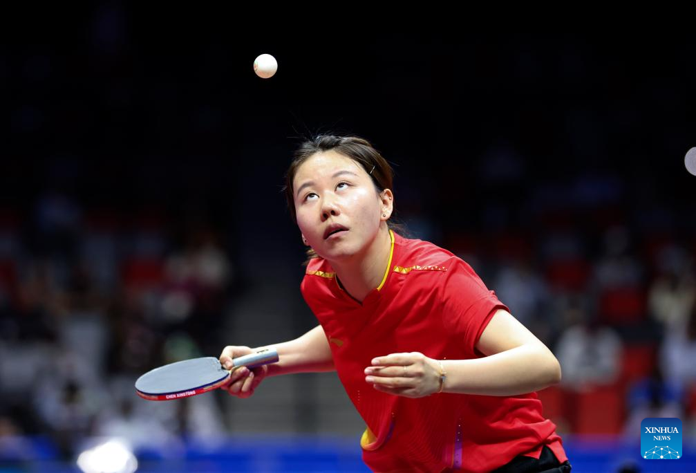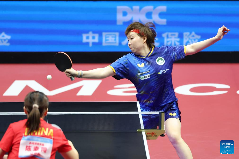 Chen Meng hits a return during the table tennis women's singles round of 16 match between Chen Meng of Shandong and He Zhuojia of Hebei at China's 15th National Games in Macao, south China, Nov. 12, 2025. (Xinhua/Liu Xu)