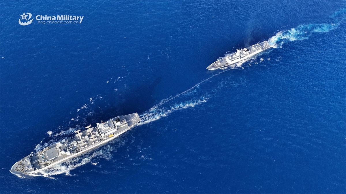 The guided-missile frigate Dali (Hull 553) attached to a flotilla with the navy under the Chinese PLA Southern Theater Command practices astern replenishment-at-sea with the comprehensive supply ship Qinghaihu (Hull 885) during a maritime training exercise in late October, 2025. (eng.chinamil.com.cn/Photo by Yu Chuanjun)