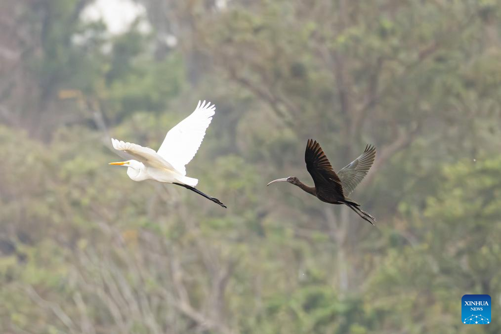 A glossy ibis flies over a herd of herons at the Haiwei National Wetland Park in Changjiang Li Autonomous County, south China's Hainan Province, Nov. 5, 2025. (Photo by Xue Meili/Xinhua)