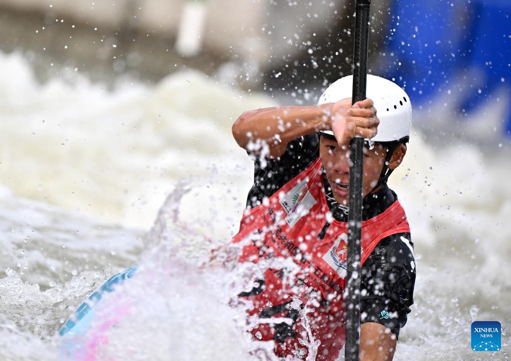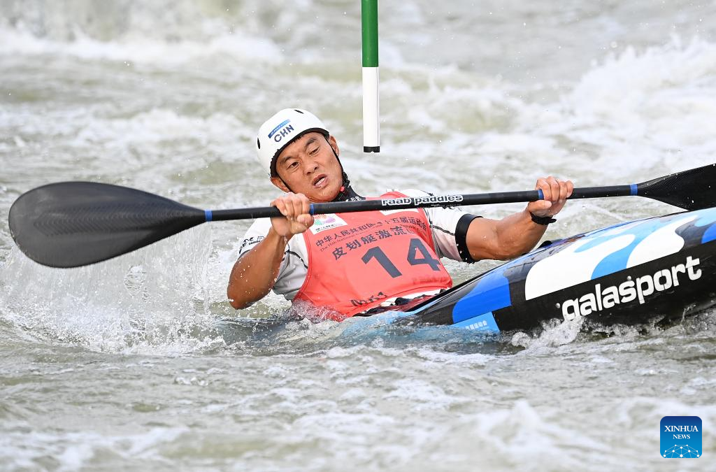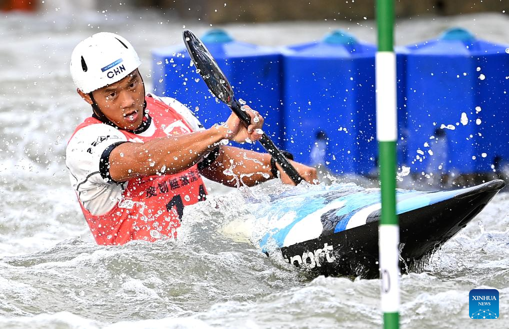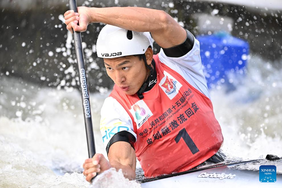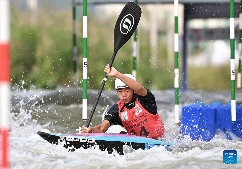 Quan Xin of Fujian competes during the men's kayak single final of canoe slalom at China's 15th National Games in Guangzhou, south China's Guangdong Province, Nov. 13, 2025. (Xinhua/Xiao Yijiu)
