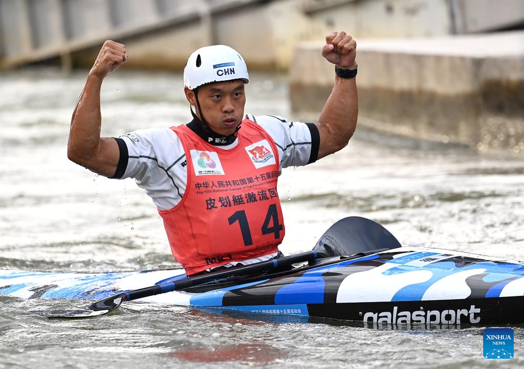 Quan Xin of Fujian celebrates during the men's kayak single final of canoe slalom at China's 15th National Games in Guangzhou, south China's Guangdong Province, Nov. 13, 2025. (Xinhua/Tang Yi)