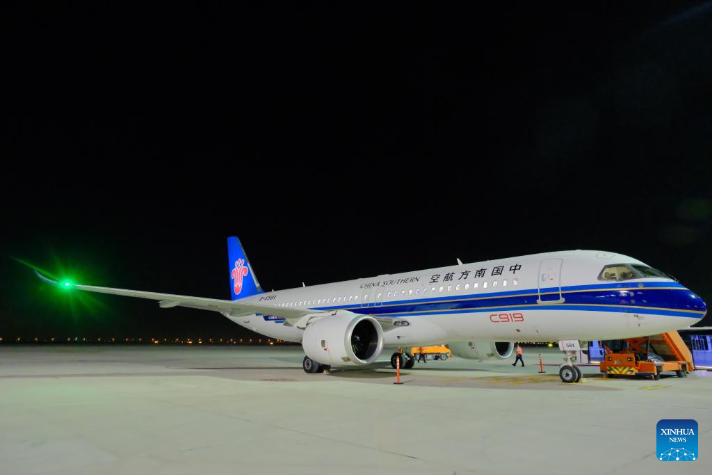 DUBAI, Nov. 14 (Xinhua) -- A China Southern Airlines C919 aircraft arrived at Al Maktoum International Airport in Dubai early on Friday for its debut at the 2025 Dubai Airshow, according to the airline.