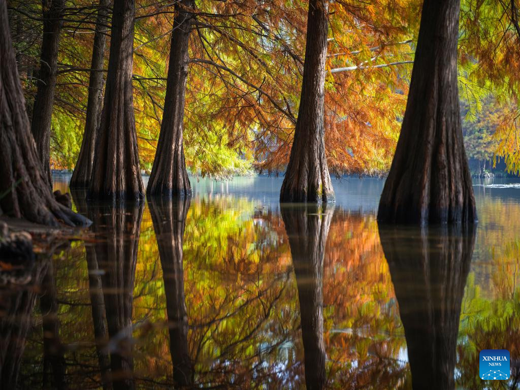 An aerial drone photo taken on Nov. 14, 2025 shows people enjoying their time in Nanjing, east China's Jiangsu Province. (Photo by Liu Jianhua/Xinhua)